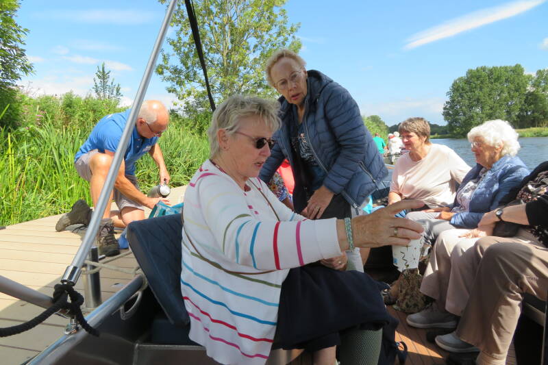 Dinsdag 29 Juli….. Een dag met een gouden randje. Na een rustige ochtendwandeling stapte we na de lunch in de auto en werden we naar Ommen gebracht voor een boottocht op de vecht. Er lagen twee sloepen klaar. Met veel moeite kregen de schippers en ons zorgteam iedereen in de boot. Terwijl ik gesteund door het team op de boot stapte voelde ik de boot heen en weer deinen. Met een kloppend hart stapte ik op het bankje omdat na te gaan zitten. Met bewondering keek ik naar de schippers die met het grootse gemak enorme stappen maakte om op een weg deinende boot te stappen.