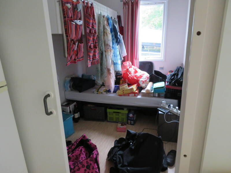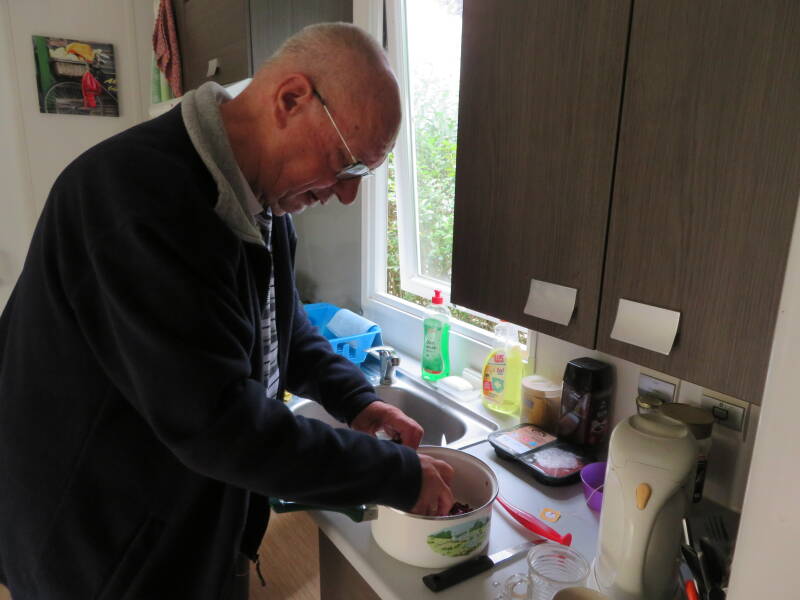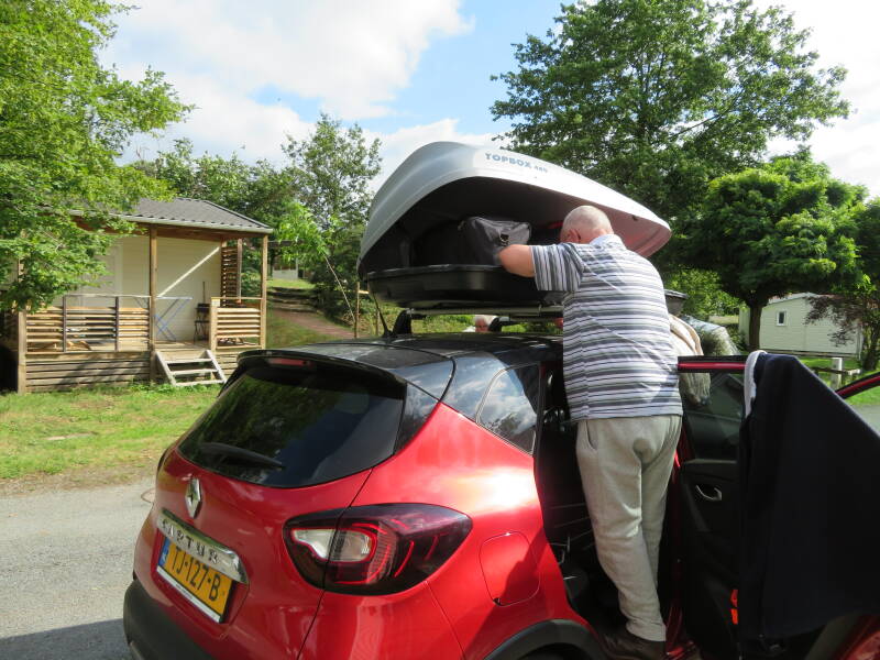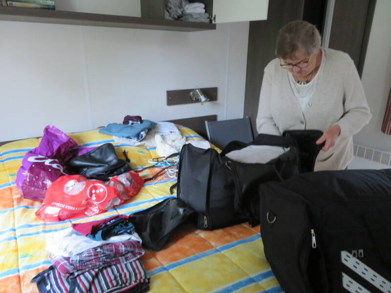 Vrijdag 16 juli 18 graden....Onze allerlaatste vakantiedag is na ruim 5 weken alles inpakken en opruimen. De hele ochtend heeft het geregend, er waaide een stevige wind en het was koud. Op ons gemak hebben we al onze spullen weer in de tassen en koffers gestopt. Ik moest iedere keer even gaan zitten, want mijn rug protesteerde met een felle pijn. Juist vandaag speelt de rugpijn fel op. Balen… Maar goed als ik ga zitten zakt het ook wel weer weg. Uiteindelijk heb ik toch maar Tramadol ingenomen en kon ik Henk helpen alle bagage in de dakkoffer en de auto op te bergen. Gelukkig kwam om een uur of 4 de zon op visite en de zon schijnt met gouden stralen alles droog en de temperatuur omhoog. Alleen bleef er een koude wind waaien en konden we niet meer buiten zitten. Gelukkige zijn de weersvoorspellingen voor morgen goed. Er komen weer warme dagen.