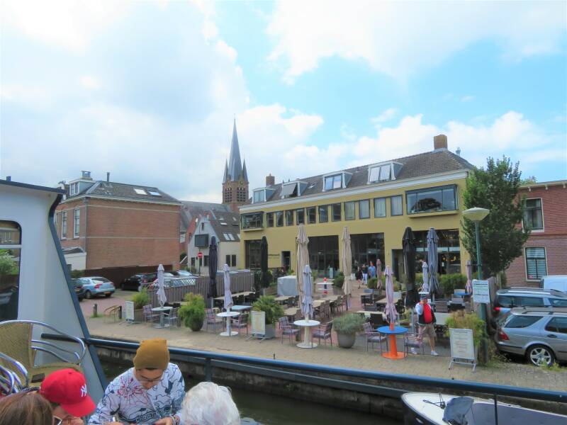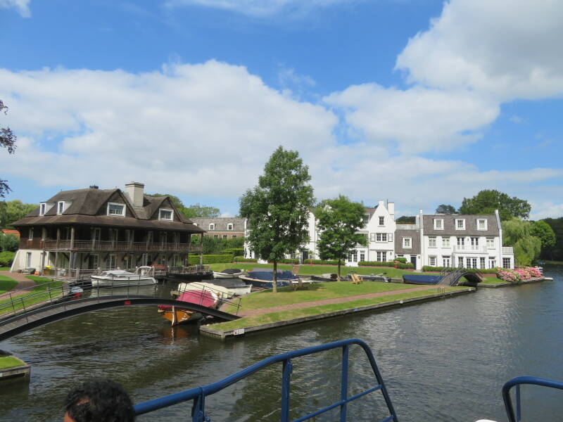 Het eerste uur dat we op de boot waren overheerste de wolken en was het fris. Er viel zelfs, nog heel even, een heel klein beetje regen. Maar gaandeweg kwamen er blauwe vlekken in de lucht en kreeg de zon steeds meer ruimte om alles in een stralend licht te zetten. We hebben heerlijk op het bovendek met de warme zon op onze rug en mijn voeten op het hek zitten genieten van de rustige voorbijglijdende schoonheid van de natuur en de prachtige huizen en tuinen die je daar zien.