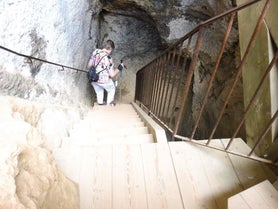 In Les Eyzies zijn we even gestopt en hebben daar even de prachtige rots bekeken. Les Eyzies wordt ook wel de hoofdstad van de prehistorische mens genoemd worden: Nergens in de wereld zijn er zoveel prehistorische vondsten gedaan als in de directe omgeving van Les Eyzies, gelegen aan de oever van de rivier de Vézère. De prehistorische mens woonde in grotten en onder overhangende kalksteenlagen in de rotswanden die waren uitgesleten door de rivier Vézère. Opmerkelijk is dat de regio rondom Les Eyzies en de vallei van de Vézère vanaf 400.000 geleden tot op heden bewoond is geweest, zonder grote onderbrekingen! Een van deze prehistorische mensen is door de beeldhouwer Dardé in 1930 uit steen gehouwen. Zijn beeltenis staat op een kalksteenlaag in de rotswand bij het Nationaal Museum van de Prehistorie en domineert het centrum van Les Eyzies.