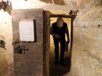 Aan het einde van de rondreis door de geschiedenis was er een grot waarin is er een internationale tentoonstelling over het thema marteling en de doodstraf te zien. Na voorstellingen in Mexico, San Francisco, Tokyo, Madrid, Firenze is deze tentoonstelling te bezoeken in een nieuwe ruimte van het Versterkte Huis van Reignac. Deze verzameling van meer dan zestig authentieke foltertuigen, guillotines en gravures en schilderijen uit die tijd biedt een visueel overzicht van de verschrikkelijke geschiedenis van de wreedheden en de menselijke gruwel. De tentoongestelde instrumenten behoren er veel tot het verleden, maar andere, worden vandaag de dag nog altijd gemaakt en gebruikt. De tentoonstelling wil laten zien dat deze manier van machtsmisbruik een onmenselijke manier is, die niet meer gebruikt kan en mag worden. Ongelooflijk om te zien wat mensen kunnen verzinnen om je macht te misbruiken en mensen op een manier te straffen. Natuurlijk begrijp ik ook wel dat men toen andere ideeën over straffen had als nu en dat we nu misschien wel eens te soft zijn. Maar al die martelwerktuigen laten het tegenovergestelde zien.