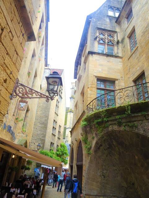 De markt slingert door de hele stad heen en er is van alles te bekijken en te koop. We hadden geluk, want de markt in Sarlat staat bekend als een hele drukke markt, maar waarschijnlijk door het sombere weer was het er rustig. We hebben op ons gemak over de markt geslenterd. Ik genoot het meest van de smalle oude straatjes en de huizen. Rondslenteren in Sarlat is een echte belevenis met al die prachtige huizen, met middeleeuwse gevels, oude portalen, torentjes, bogen en passages. De stad heeft veel van zijn oorspronkelijke karakter bewaard. Het lijkt of de tijd hier is blijven stilstaan en toch is er volop bedrijvigheid met winkels, restaurantjes, toeristen.
