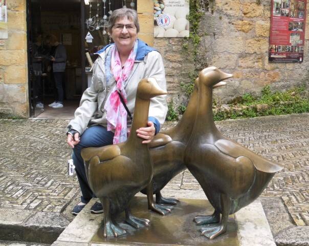 Toen we vanmorgen wakker werden regende het en toen tegen acht uur uit bed kwamen zagen we buiten een donkere grijze lucht. Het was weer droog maar daar was alles mee gezegd. Het was koud buiten, 12.5 graden. Ik klikte buienradar aan en zagen dat er de eerste uren grote kans op regen was. We besloten ons plan om naar de markt in Sarlat te gaan maar even op te schuiven. Tegen elf uur een beetje opgeklaard en de berichten voor de eerste drie uur gaven geen regenbuien van betekenis aan. Dus in de auto gestapt en naar Sarlat gereden. Op de eendje in Sarlat heeft Henk dit mooie plaatje van mij gemaakt.