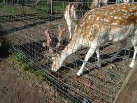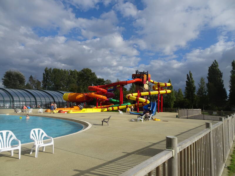 We zijn op camping Dune Fleurie in Quend Plage in Picardie. Het autovrij Ecologisch Vakantiepark Belle Dune ligt in een beschermde omgeving op 2 km afstand van de zee en is werkelijk een oase van rust. Het vakantiepark bestaat uit gekleurde gebouwen met Picardische invloeden, verspreid over 6 wijken. Het is camping met 1200 huisjes en caravans. Door de pastelkleuren in het interieur van onze vakantiehuizen en appartementen straalt alles hier rust en ontspanning uit. Eigenlijk dus niets voor ons. Wij kiezen altijd klein, maar deze keer wilden we niet te ver van huis. Gelukkig is de camping ruim en mooi opgezet met veel bos en speel en rustplekken. We hebben vandaag wat rondgewandeld onze stijve ledematen moeten getraind worden) en wat foto's gemaakt. Op een bankje hebben we zitten genieten van de zon en de kippen en de hertjes. Deze camping is echt een kinderparadijs. Een fantastisch zwembad en mooie speelplekken. Onze caravan staat op een rustige plek, met zon en schaduw. we kijken uit op de bomen en het groen.
