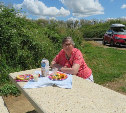 Het was druk op de weg, bij Antwerpen een lange file, twee uur vertraging betekende dat we pas om kwart over zes de camping opreden. Het weer viel tegen, het was fris en regelmatig reden we regenbuien in en hoorde ik de druppels op het dak kletteren. Eenmaal in Frankrijk was het droog en zagen we de zon schijnen.