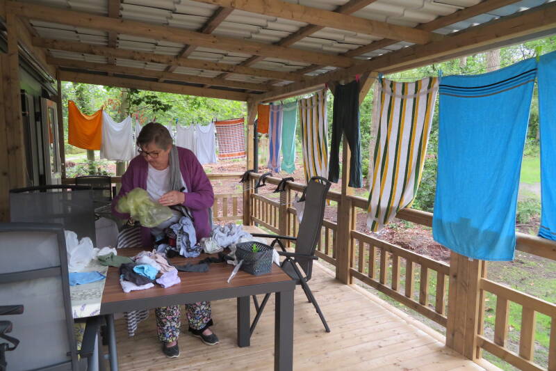 Zaterdag 15 juni 17 graden.... Na een 10 dagen vakantie stond er een grote zak vol was en waren onze handdoeken en ons ondergoed echt aan een wasbeurt toe. Het zag er niet hoopvol uit toen ik vanmorgen opstond. Koud en nat… toch met onze zakken met was naar de wasmachine en die het werk laten doen. De weersvoorspellingen voorspelde dat zon en buien elkaar zouden afwisselen. Toen ik de was uit de was machine haalde en onder het afdak van ons balkon ging ophangen regende het. Maar niet veel later klaarde het weer op. Er stond een stevige wind en tot mijn stomme verbazing was om 3 uur mijn hele was droog gewapperd. Vlak nadat ik alles afgehaald en opgevouwen had viel er weer en stevige bui.