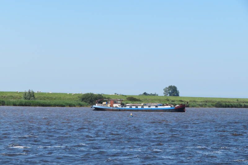 Om kwart over 1 stapte we op de Vlinderbalg en om half twee werden de trossen losgegooid om een mooie tocht over het Lauwersmeer te varen. Er was een mooie golfstag en er stond een stevige wind. Ik was blij dat ik een vestje bij me had want vol in de wind voelde het behoorlijk fris. We hebben zitten genieten van de prachtige uitzichten. De kapitein vertelde het verhaal van het ontstaan van dit prachtige gebied. Het afsluiten van de Lauwerszee met een 13 km lange dijk moet een gigantische klus geweest zijn. Na een tocht van ruim twee en half uur kwamen we uitgewaaid weer terug in Oostmahorn.